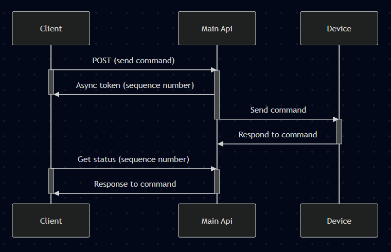 The Main API itself is responsible for sending commands to devices and retrieving their responses. Most API are asynchronous (as the device may be offline when the API is called) while others return cached responses from the device.